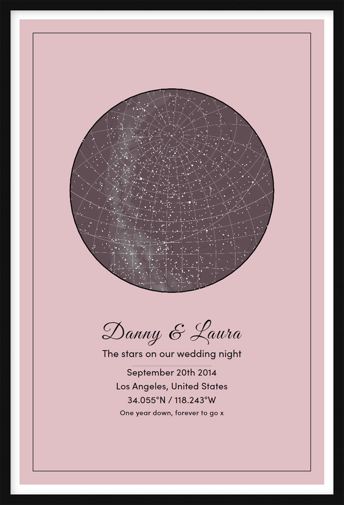 Celebrate your first year of marriage with a custom star map, intricately capturing the celestial scene of your most memorable nights from the first year of marriage. Whether it was the sky above on your wedding night or another special evening, our star map poster lets you precisely chart the heavens with detailed customization.