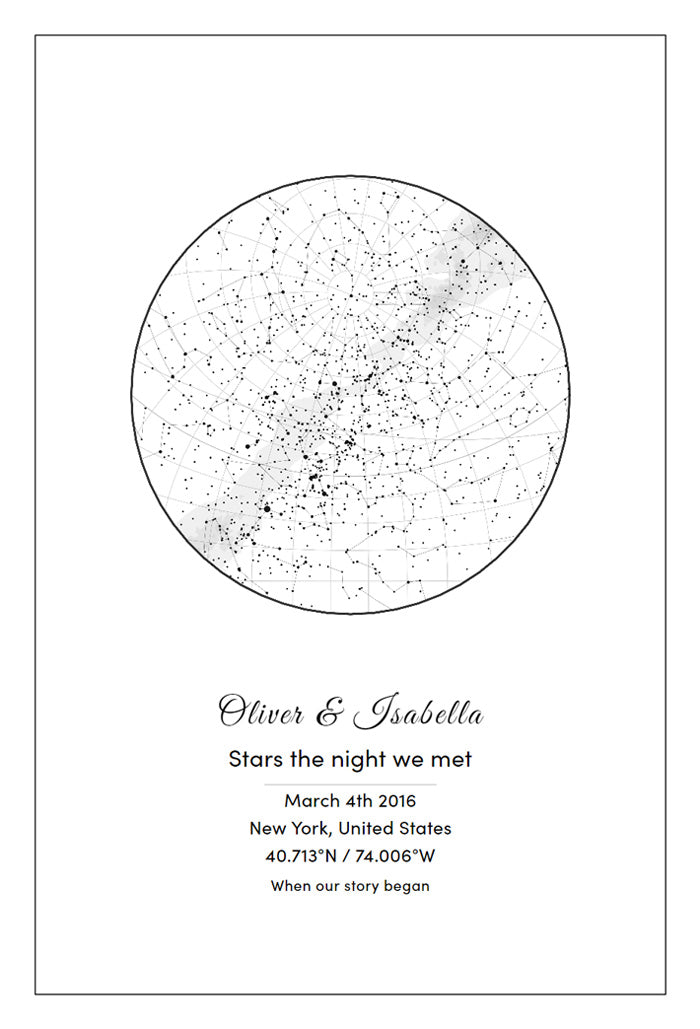 A. A star map is a unique and thoughtful way to celebrate a significant moment shared between loved ones. It's a gift that combines personal significance with the awe-inspiring beauty of the night sky, making it a cherished stars the night we met keepsake that can be admired for years to come.
