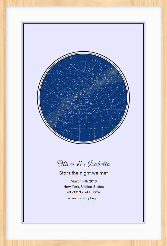 A. Consider the decor of the space where you plan to display your star map. Our frames come in black, white, and natural colors, with options for a mount, to complement any room. Think about whether you prefer a bold statement or a subtle addition to your decor when selecting the frame for your stars the night we met map.
