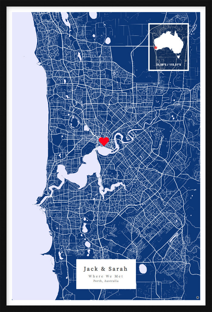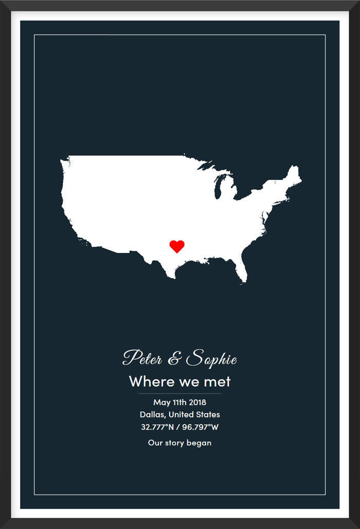 A. We offer a range of 6 wooden frame sizes which are available in black, white, and natural, to ensure your where we met map will perfectly and enhance any space.